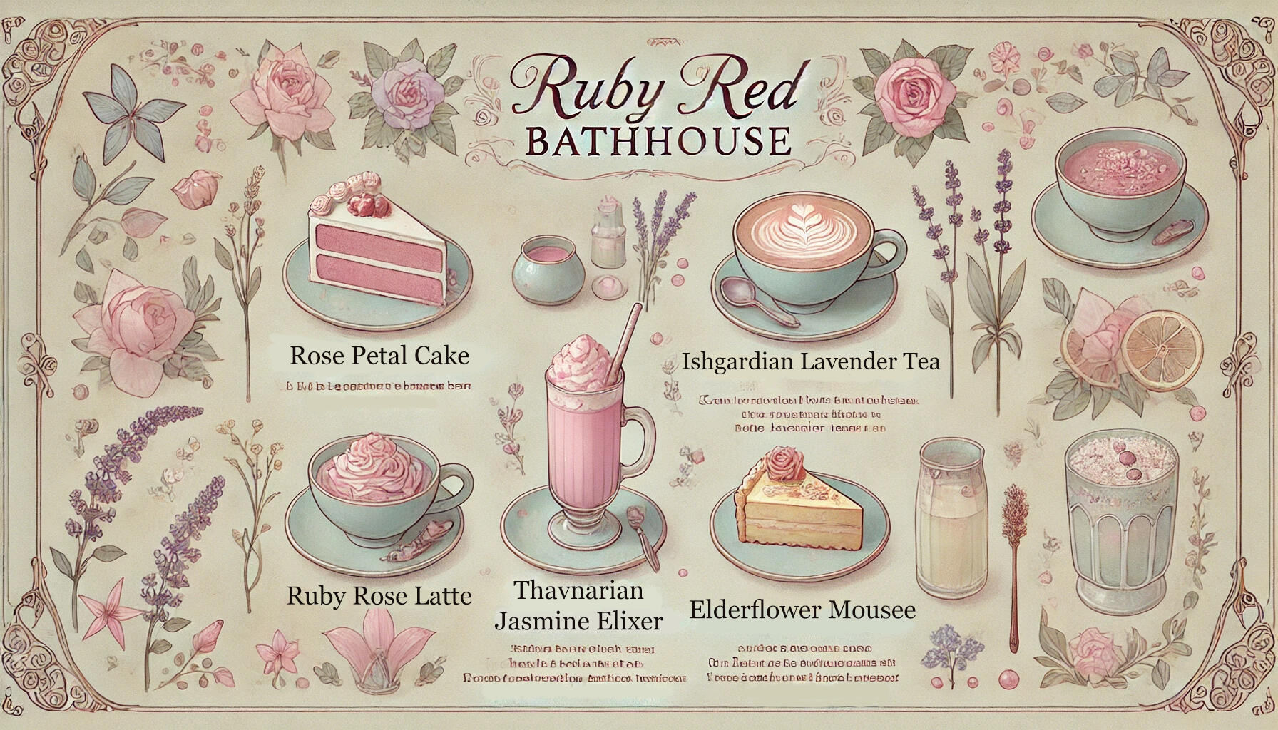 Welcome to the Ruby Red Bathhouse, a sanctuary of serenity and tranquility nestled in the picturesque Shirogane. Our bathhouse is a peaceful escape from everyday life, offering you the chance to relax and rejuvenate in a calming environment.At the Ruby Red Bathouse, we believe in the healing power of water and community. Our soothing baths are perfect for washing away the stresses of the day, whether you're seeking peaceful solitude or laughter with friends. Enjoy the gentle melodies played by our talented bards, enhancing the serene ambiance of your visit.To complement your experience, indulge in our delightful selection of snacks and drinks. From calming teas to delicious sweets, our menu is crafted to satisfy and refresh.Come and experience the tranquility of the Ruby Red Bathhouse, where every visit is a retreat into peace and relaxation.